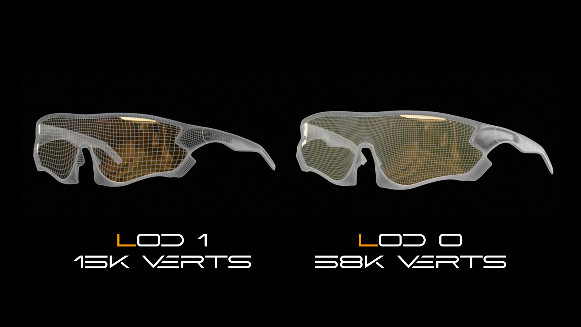 Il modello presenta un elevato livello di dettaglio, con superfici fluide e una lente unica continua che definisce l’intera struttura frontale, mantenendo una topologia pulita ed efficiente per applicazioni real-time.